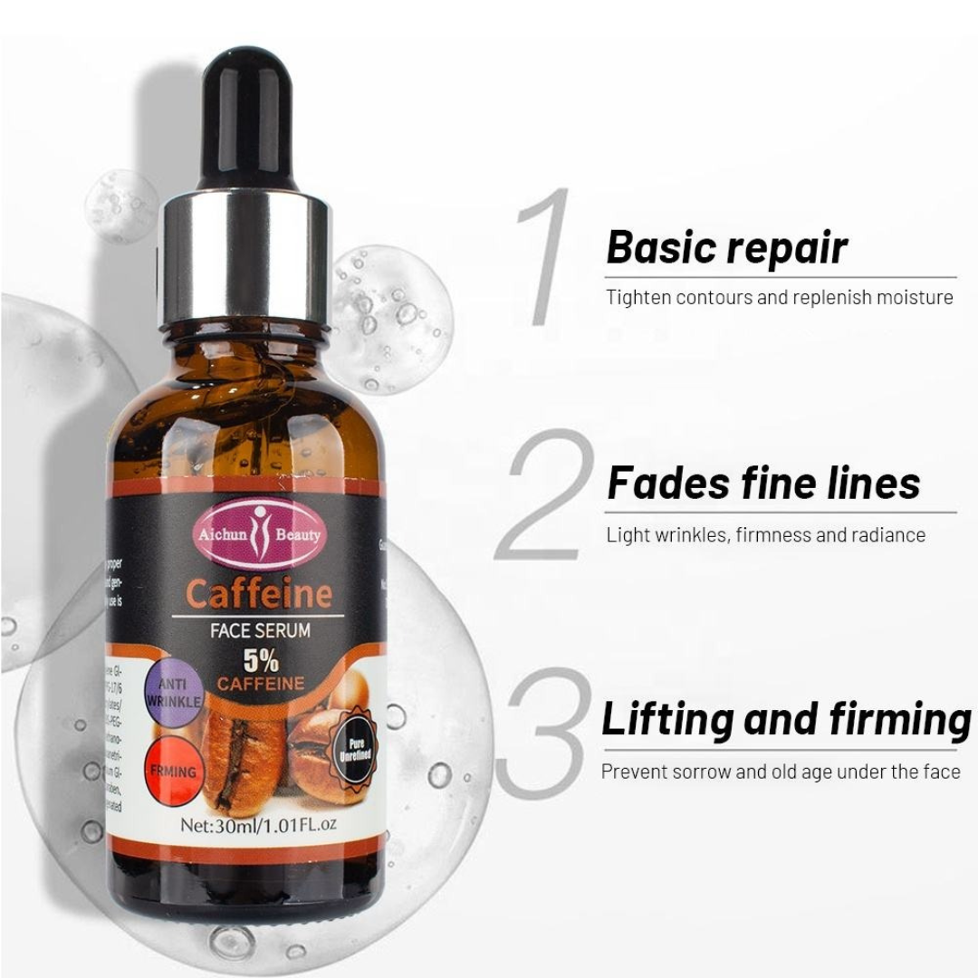 Aichun Beauty 5% Caffeine Face Serum is a lightweight, fast-absorbing serum formulated to refresh tired, stressed-looking skin. Infused with 5% caffeine and antioxidant botanicals, it helps reduce the appearance of puffiness and dark circles, while energising and brightening your complexion. Suitable for most skin types, it can be layered easily under moisturiser or makeup.