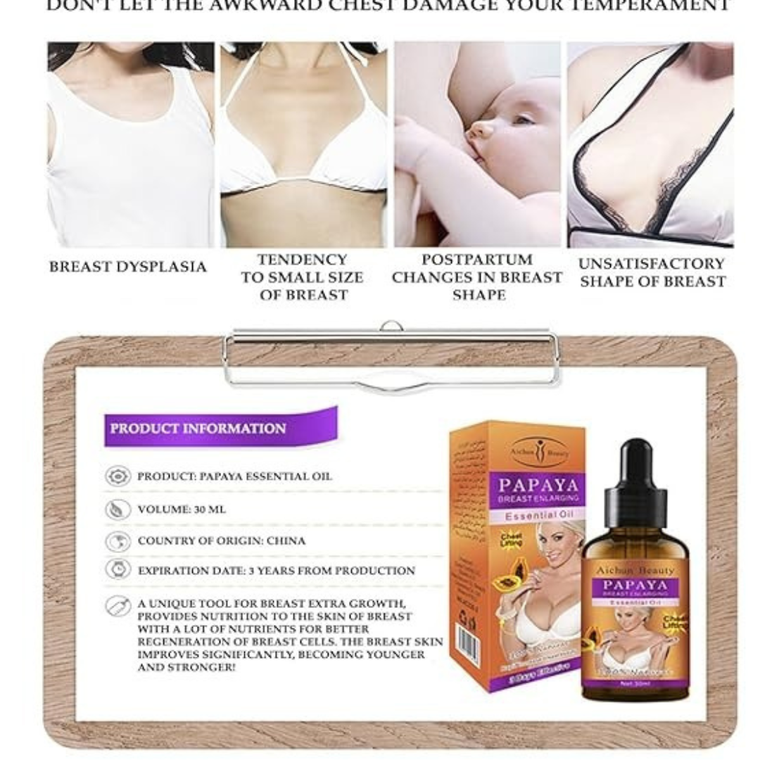 Aichun Beauty Papaya Breast Enlarging Essential Oil is formulated with natural papaya extract and herbal ingredients that help firm, lift, and enhance the appearance of your bust. With regular use, it supports improved elasticity, promotes cell regeneration, and may give the breasts a fuller and more youthful look — naturally and safely.