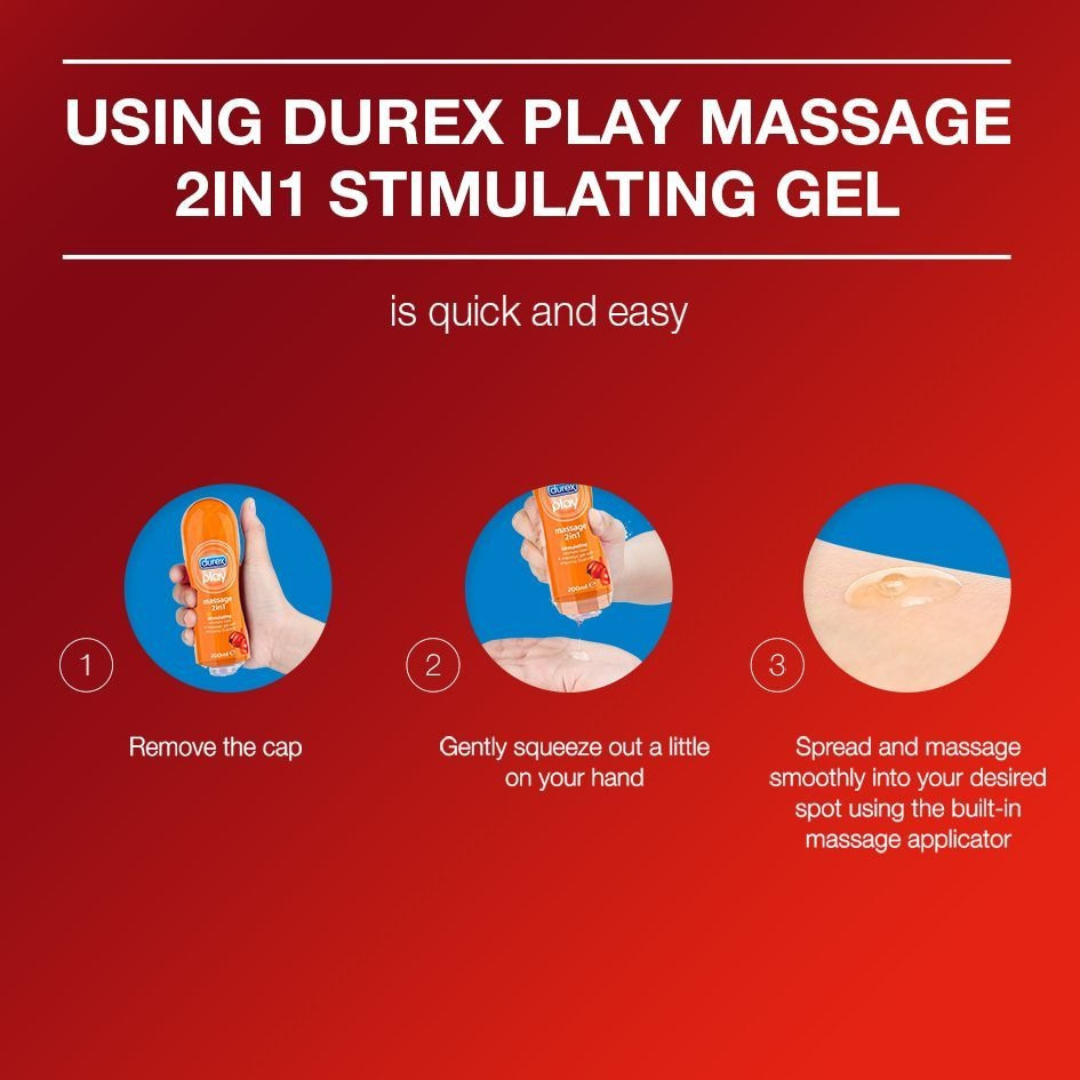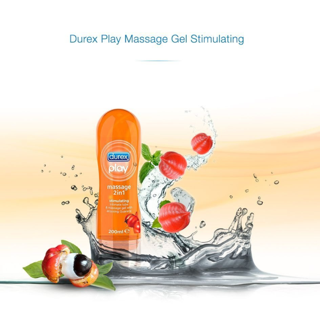 Durex Play Massage Stimulating Gel is a 2-in-1 intimate lube and massage gel enriched with Guarana extract, known for its stimulating properties. Perfect for sensual massages and intimate moments, it provides a smooth, silky feel that enhances pleasure and closeness. The non-greasy, skin-friendly formula is safe to use all over the body and can be applied to intimate areas. Ideal for couples looking to elevate their intimacy and explore new sensations.