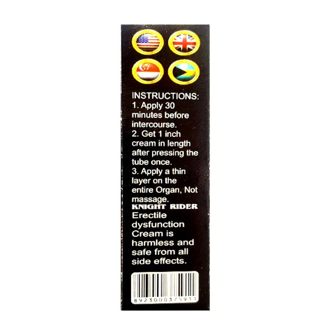 Knight Rider Delay Cream is an herbal cream for delaying/increasing sex timing. Using Night Rider Cream, you will get a Maximum long duration, stop Premature Ejaculation, Increase Stamina, and 1st Choice For More Pleasure.